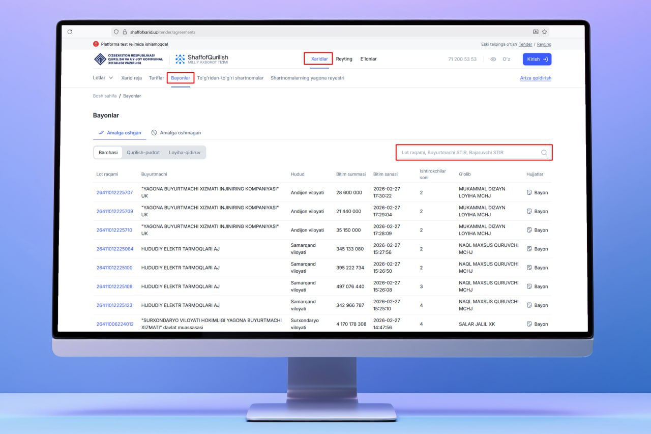 Buning uchun shaffofxarid.uz saytiga kirib, «Xaridlar» bo’limi, undan so’ng «Bayonlar» tanlanadi.